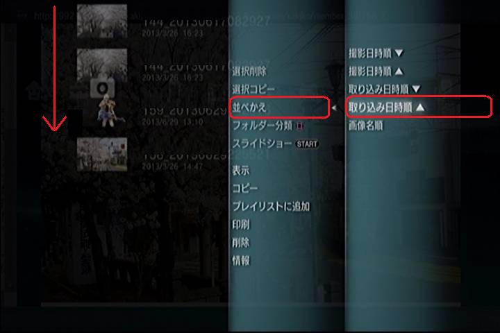 並べかえ - 取り込み日時順▲ を選択して○を押します