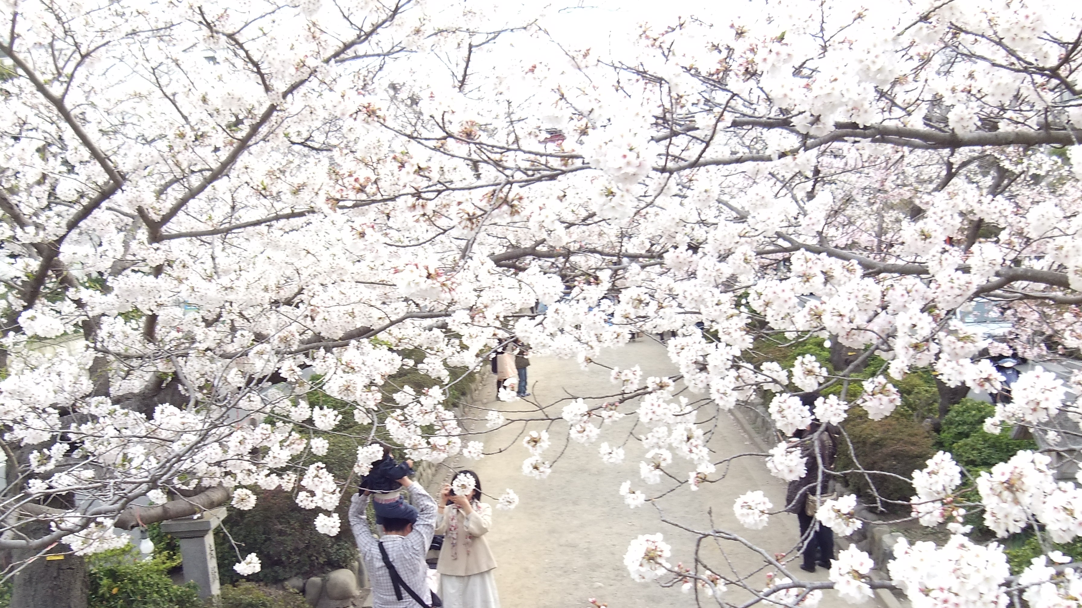 春のサクラの下で家族が写真を撮ってる。