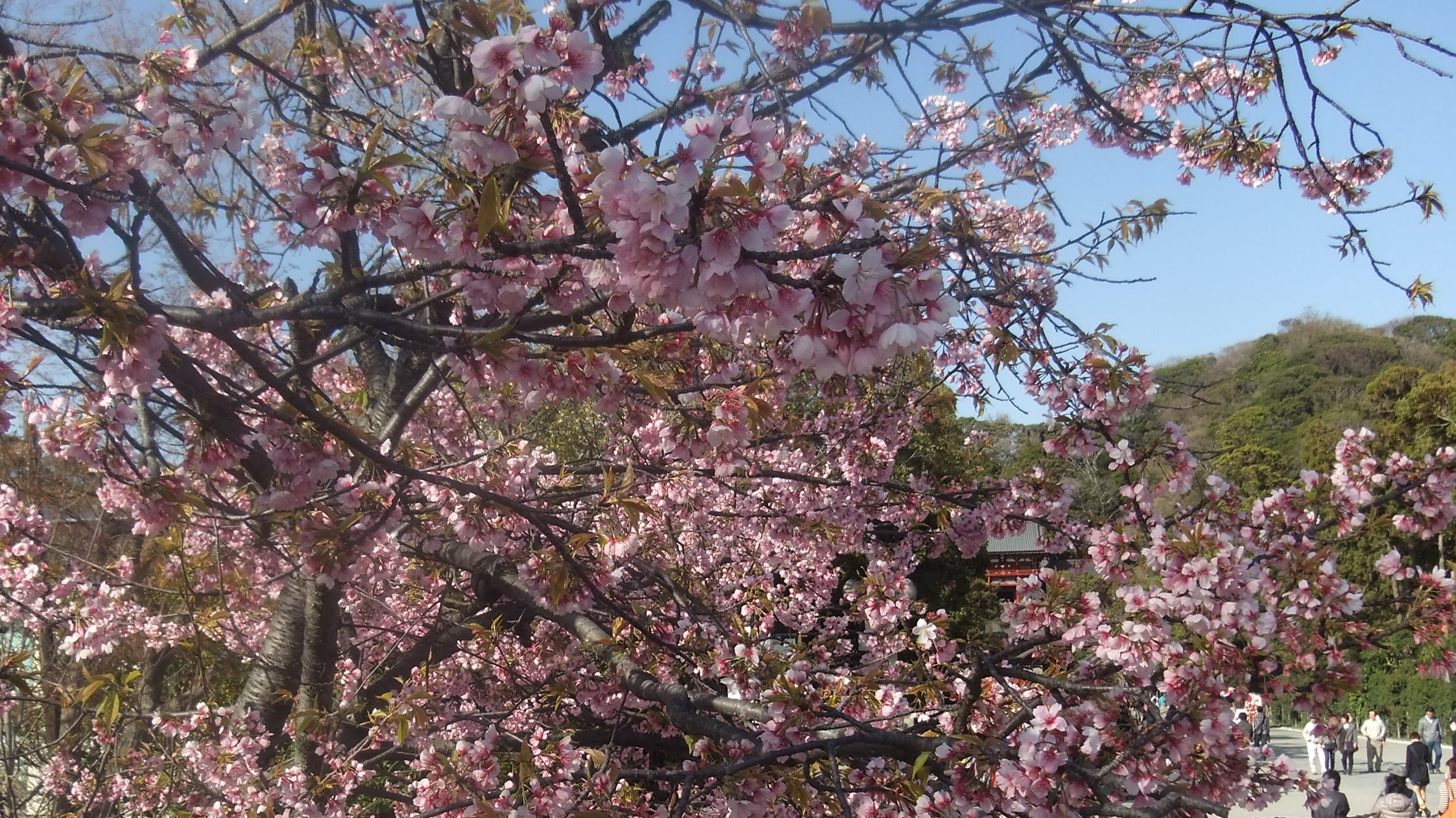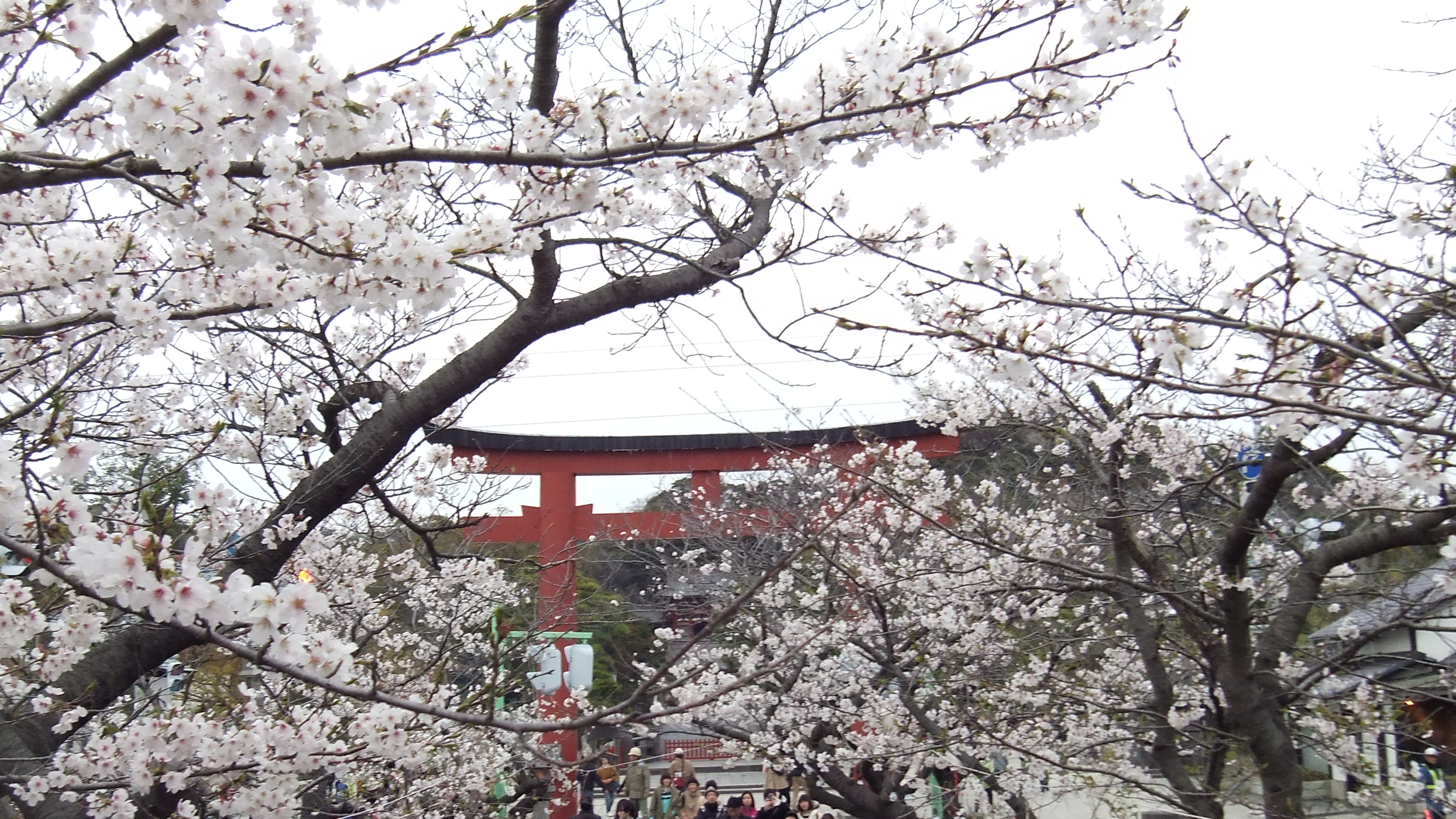 桜の向こうに鳥居と神社が見えます。